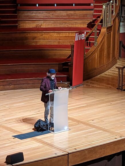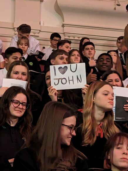 We heard from wonderful poetry from Carol Ann Duffy, Simon Armitage, Imtiaz Dharker and Daljit Nagra but the man who really stole the show was Mr Jon Agard. As the 73 year old approached the stage, the auditorium erupted into cheering and applause and our own Sapphire even made him a sign. His poetry is particularly engaging as it’s playful as well as meaningful and he reminded pupils of the point of poetry – that it’s not just something learnt for GCSEs but a way to express and learn.